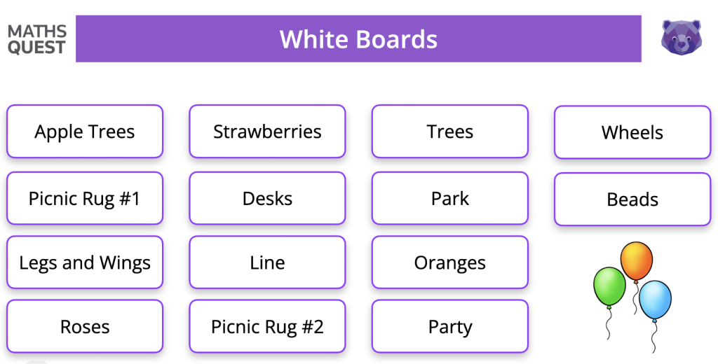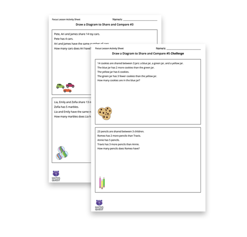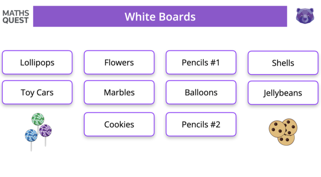 Select 3 or 4 to solve together using the gallery, displaying the question on screen and asking students to draw their diagrams on mini white boards.