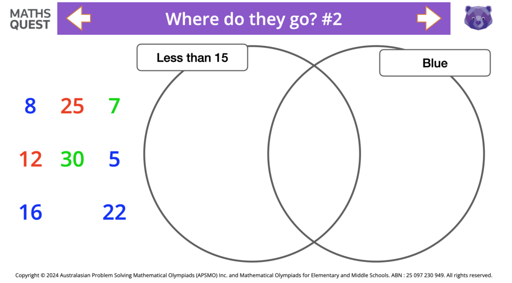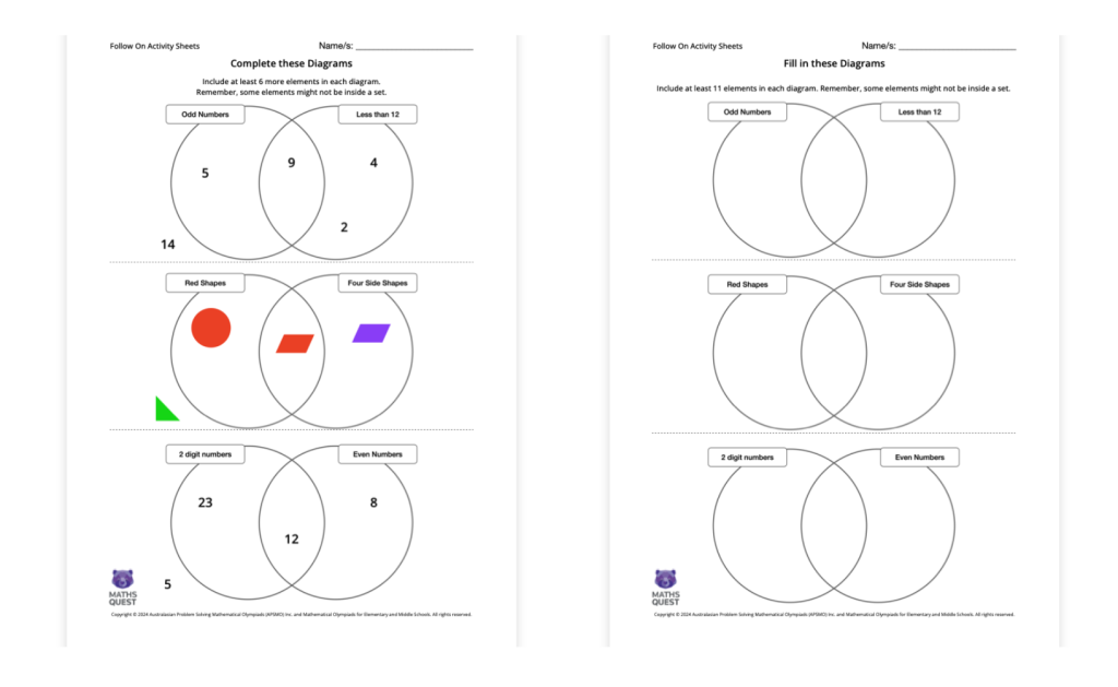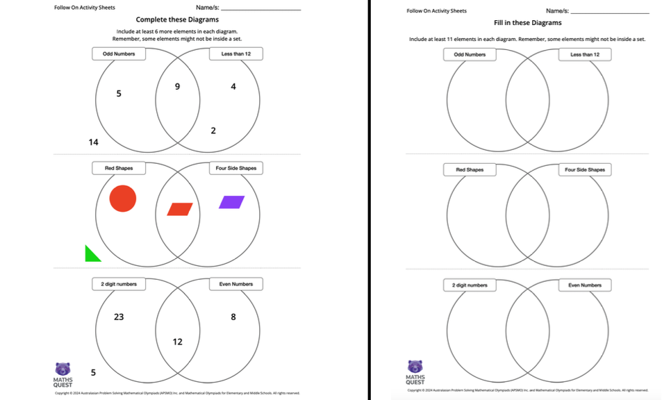 The second has empty sets and asks students to add at least 11 elements to the different regions.